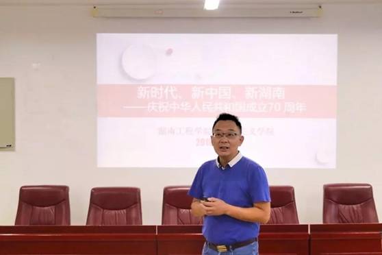 谢骐以“新时代、新中国、新湖南”为题,描述了从中国共产党的建立到中华人民共和国的成立,再到改革开放后,中国特色社会主义道路的发展历程。他指出,新中国成立70周年以来,我国经济的迅速发展离不开党的正确领导、人民群众的团结奋斗,从“两弹一星”到“和谐号”,再到70年来我国人均GDP70倍的增长,我国综合国力得到了快速提升,人民生活水平得到了极大改善。党的宗旨是“为人民服务”,我们必须坚定不移地跟党走,他强调只有中国共产党才能带领中华民族走向复兴。他结合自身的生活经历,真真切切地为同学们描述了新中国成立70周年来,湖南的经济产业,教育事业等方面得到迅速发展的新局面。会议末,谢骐用问答的方式与同学们就会议主题进行了深入交流。
