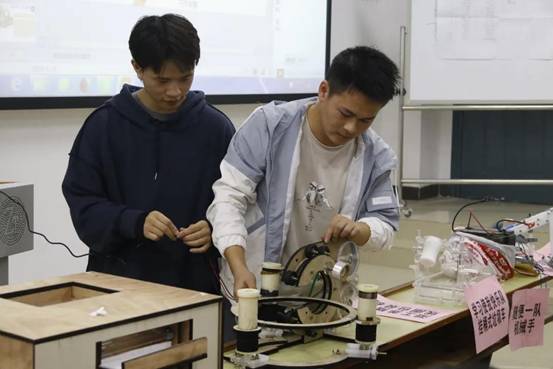 为增强作品的实用性、创新型,参赛团队从去年寒假就着手准备,疫情期间通过视频会议商讨方案,返校后加班加点完成实物模型制作。“对什么队”团队在陈乐尧老师的指导下,基于现有的安检扫描装置,设计了一种行李消杀防疫通道。该作品采用模块化传动机构,利用光电门感应智能控制泵,进行消毒水雾的喷出与停止。为了解决大量盖章浪费人力资源,“时间管理队”在关跃奇老师指导下设计出自动盖章机。该装置通过链条传动,平行四杆机构,控制开关,实现自动盖章。此次大赛参赛作品的完备性有了很大的提升,15件作品有14件实现了电机驱动及电气控制,且都具有传动机构和执行机构。