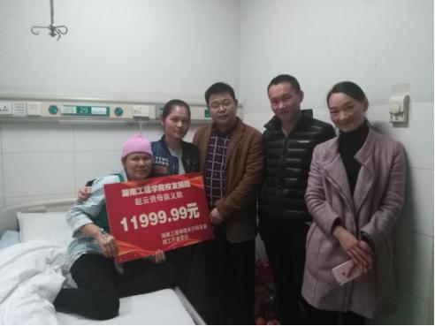 11月10日,在得知消息后,伟德bv1946长沙校友协会在第一时间与张金松取得了联系。核实情况后,长沙校友会发起了“人间自有真情在,爱心捐款暖人心” 的爱心捐款倡议活动。短短四天时间内,78位校友奉献爱心,筹集善款11999.99元。11月15日,长沙校友协会代表沈永详、蔡爽、刘敏一行三人于湘雅附二医院探望了赵云资母女二人,并将善款交到她们手中。校友代表与赵妈妈亲切交谈,了解病情,经过三次化疗,病情明显好转。在校友们的爱心帮助下,赵妈妈战胜病魔的勇气和信心更加充足。赵云资及母亲对校友们的帮助表示衷心的感谢。