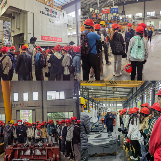 在湖南晓光汽车模具有限公司朱林之和阳新伟的带领下学生参观了模具工厂和冲焊工厂。他们详细了解汽车车身模具的生产制造过程,近距离熟悉现代先进生产设备的生产过程,现场感受传统制造业在自动化、信息化、智能化升级过程中的魅力,沁润式传承工匠精神和工匠文化。