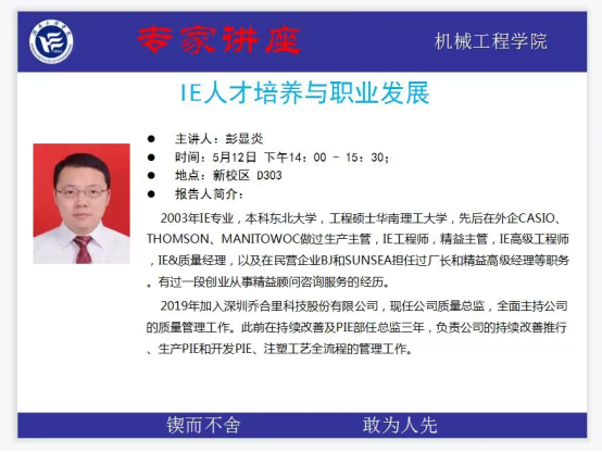 5月12日下午,1946伟德国际源自英国在教学楼d303举办“IE人才培养与职业发展”讲座。深圳乔合里科技股份有限公司质量总监、企业导师彭显炎担任主讲嘉宾,1946伟德国际源自英国工业工程教研主任谢富春主持讲座,工业工程专业学生听取讲座。