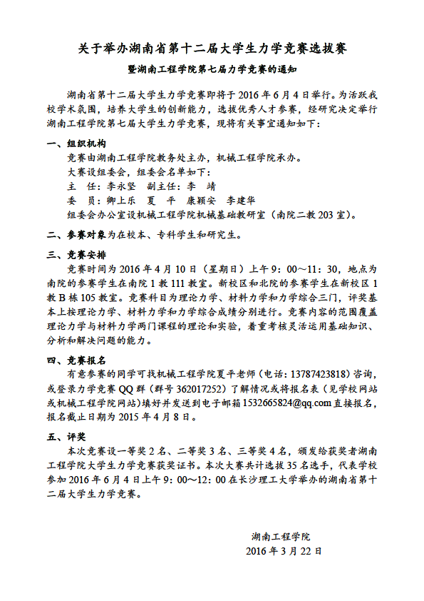 关于举办湖南省第十二届大学生力学竞赛选拔赛暨伟德bv1946第七届力学竞赛的通知