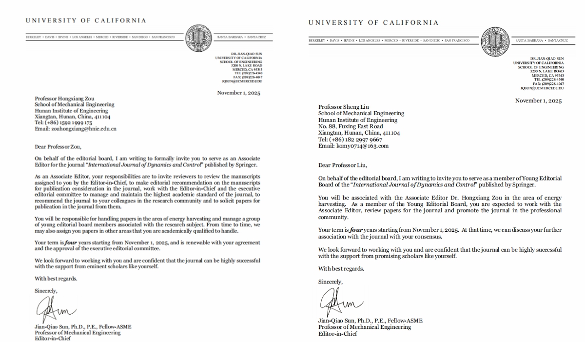 《International Journal of Dynamics and Control》是动力学、振动与控制领域具有重要影响力的国际期刊,致力于发表该领域前沿研究和工程应用的重要成果。两位教师受邀担任期刊学术职务,不仅是对其个人学术水平和声誉的肯定,更将为我院动力学与控制研究领域搭建更广阔的国际学术对话平台,助力学院精准对接国际前沿方向,深化与海外高水平团队的合作,推动学科成果走向国际舞台。